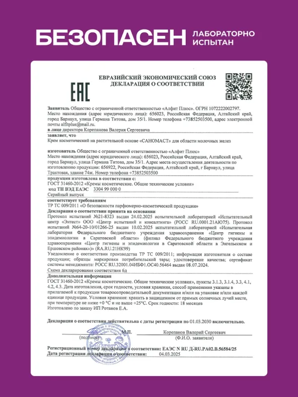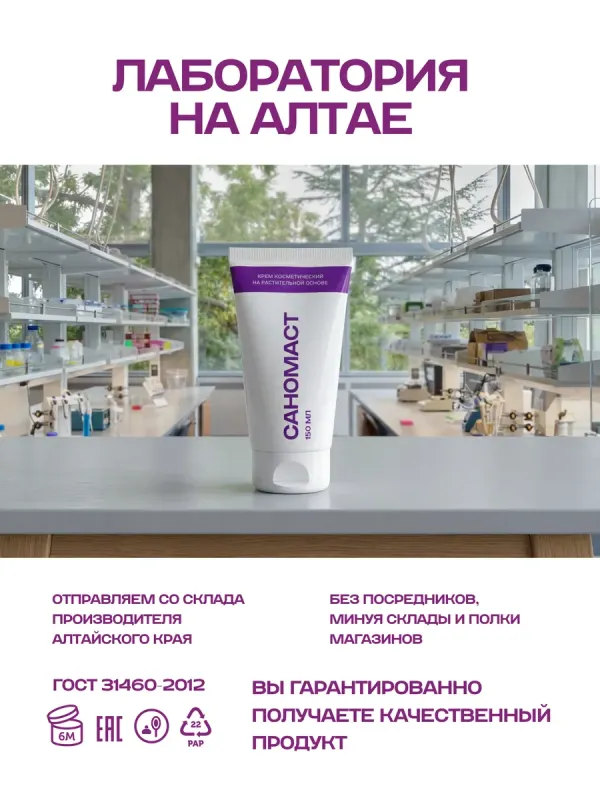 САНОМАСТ — косметический крем‑гель для наружного применения на коже молочных желез. Разработан на основе алтайских растительных экстрактов и ухаживающих компонентов, чтобы мягко уменьшать дискомфорт, поддерживать упругость кожи и улучшать её состояние при курсовом применении.